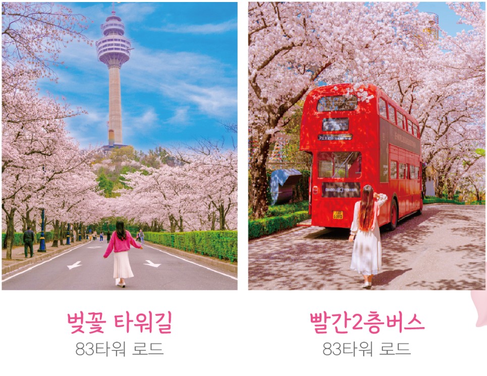 낮에는 핑크색 벚꽃을, 밤에는 라이팅 쇼와 함께 화려한 빛으로 물든 벚꽃의 색다른 모습도 즐길 수 있습니다.